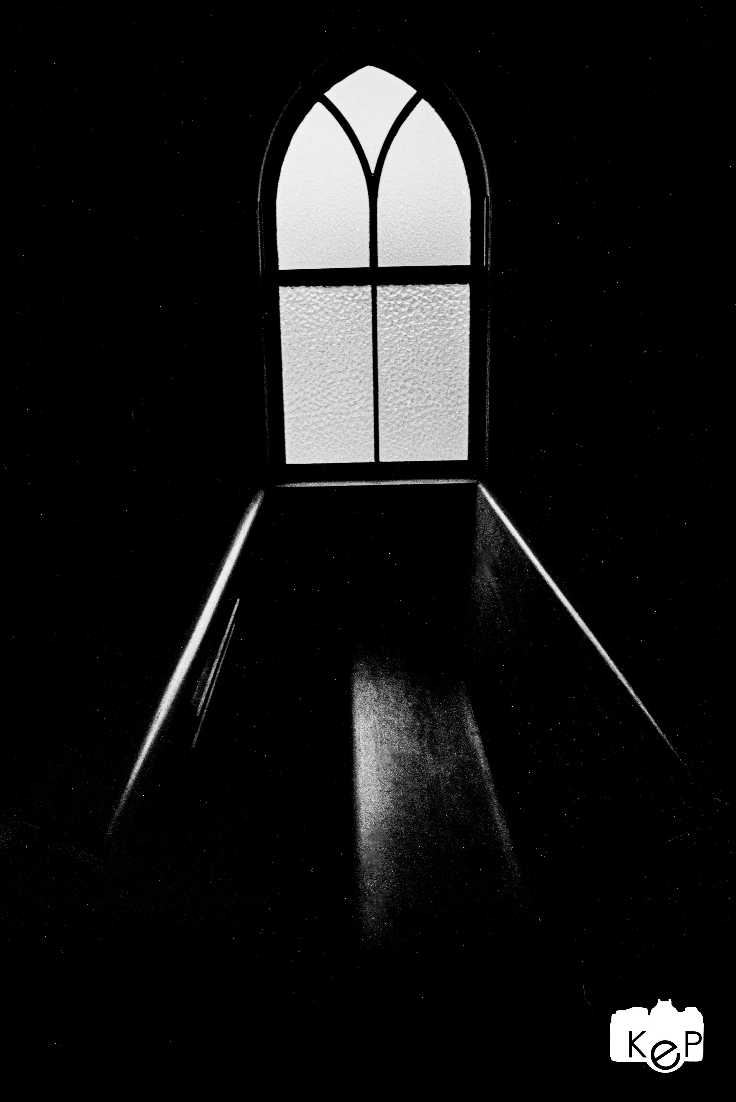 A window from Union Point United Church. The inky shadows frame the windows and the reflections on polished pew.